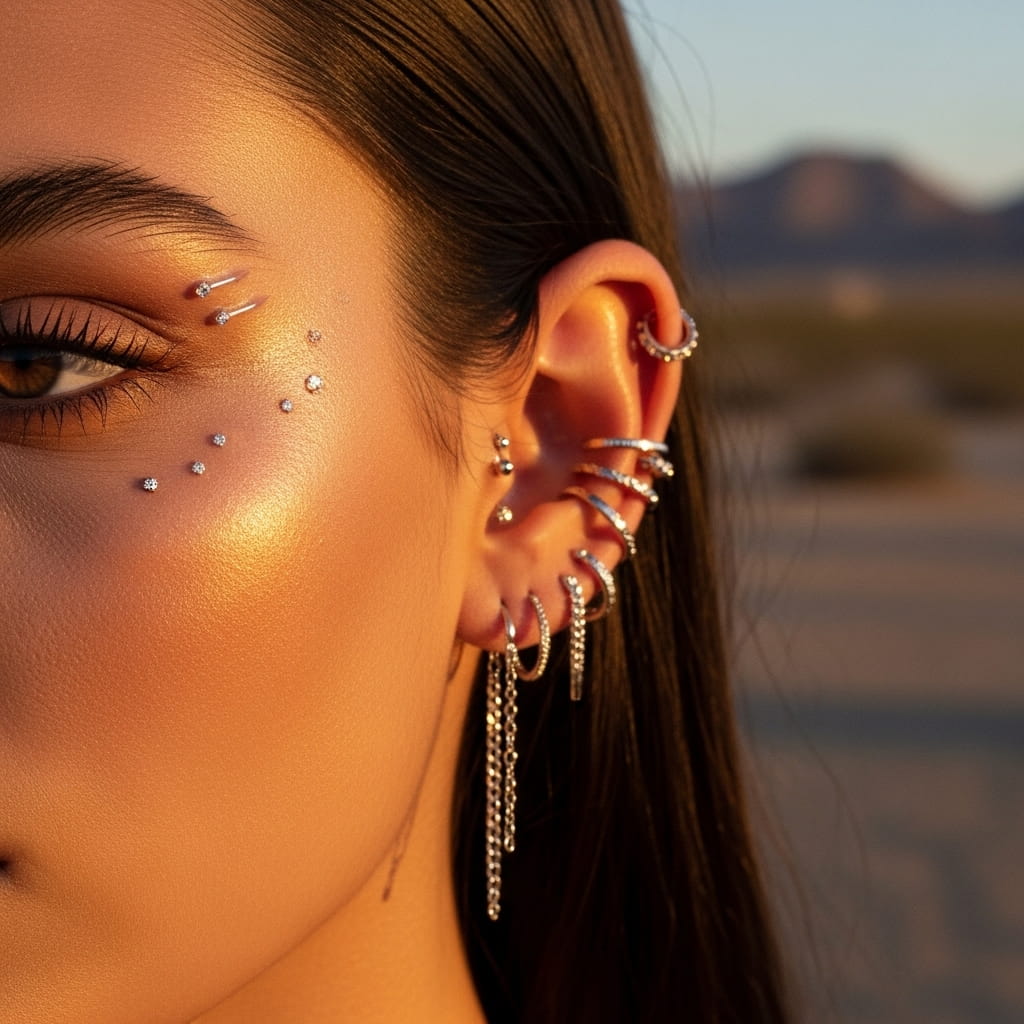 Ear piercings Phoenix dominate right now – stacked lobes and constellation designs with mixed jewelry (studs, hoops, chains) are huge. Conch and helix placements offer bold statement looks with gems or hoops.